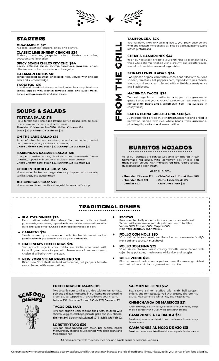 The menu at Hacienda On The Lake is a delightful fusion of traditional dishes, with standout offerings that keep customers coming back for more. Start your meal with the Chicken Tortilla Soup, a comforting bowl of homemade goodness topped with sliced avocado, brimming with flavor and perfect for the soul. Another customer favorite is the Hacienda's Caesar Salad, a fresh and crisp mix of romaine, diced tomatoes, and housemade dressing that feels both refreshing and satisfying.